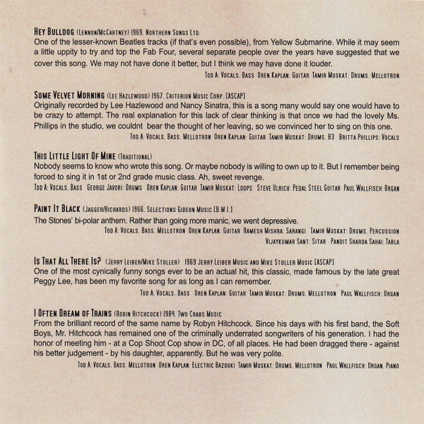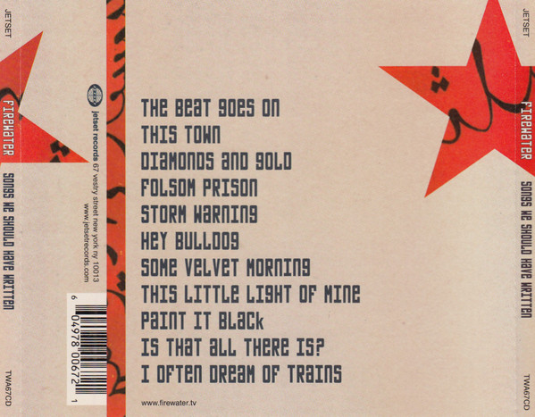 bass Tod Ashley booking [european booking by] IBD Booking booking [european booking by] Sabine Waltz booking [north american booking by] The Billions Corporation booking [north american booking by] Tom Windish design [sleeve design] Tod Ashley tracks 1 to 7, 9 to 11 drums Tamir Muskat tracks 1 to 10 guitar Oren Kaplan mastered by Emily Lazar mixed by Dan Shatzky mixed by Tamir Muskat producer Tamir Muskat producer [produced with] Tod Ashley technician [microphone placement], tape op, technician [compression] Dan Shatzky tracks 1 to 4, 6 to 12 vocals Tod Ashley Recorded At Vibromonk Studios Recorded At Micro-Moose Mixed At Vibromonk Studios Mastered At The Lodge, New York Glass Mastered At WEA Mfg. Olyphant Pressed By WEA Mfg. Olyphant Firewater's first collection of covers. Recorded and mixed at Vibromonk Studios, Brooklyn, USA, except track 8 recorded at Moose, Brooklyn, USA