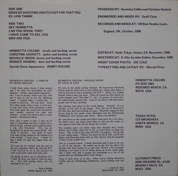 bass, backing vocals Bernie Wandel drums, backing vocals Mick Green engineer, mixed by Geoff Clout featuring [special guest appearance] Henry Rollins guitar, backing vocals Chris Haskett liner notes Henry Rollins liner notes Louis M. Face mastered by John Golden photography by [front cover] Joe Cole producer Chris Haskett producer Henrietta Collins typography [typesetting], layout Illiterati Press vocals, backing vocals Henrietta Collins Phonographic Copyright (p) Texas Hotel Copyright (c) Texas Hotel Published By 2.13.61 Published By Dustbowl (2) Published By Alley Music Corp. Published By Trio Music Recorded At Offbeat Studios Edited At Radio Tokyo Mastered At K Disc Mastering Mastered At Greg Lee Processing Recorded and mixed at Off Beat Studios Leeds, England, UK, October, 1986. Edited at: Radio Tokyo, Venice, CA, November, 1986. Mastered at: K-Disc, December 1986.