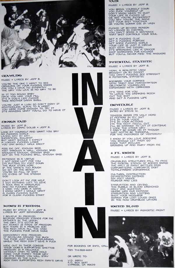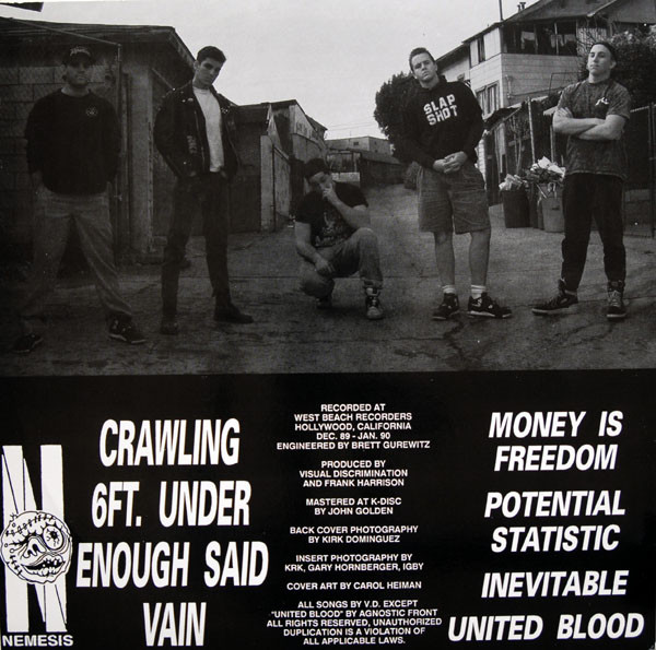 cover, artwork [cover art] Carol Heiman engineer Brett Gurewitz mastered by John Golden tracks a1, a2, a4, b2, b3 music by, lyrics by Jeff Banks photography by [back cover photography] Kirk Dominguez photography by [insert photography] Gary Hornberger photography by [insert photography] Igby photography by [insert photography] Kirk Dominguez producer Big Frank Harrison producer Visual Discrimination Recorded At Westbeach Recorders Mastered At K Disc Mastering Mastered At Greg Lee Processing Recorded in December 1989/January 1990 at West Beach Recorders, Hollywood, California. Mastered at K-Disc. Released with fold-out lyric sheet.