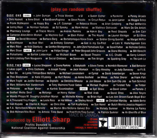 Track 2.03 - Recorded at RareBookRoom, Brooklyn. Text based on Charles Ives' preamble to his Suggestion for a 20th Ammendment of 1920. P/C Basnouph Noupha. Track 2.10 - Selection from the book Ambient. Track 2.23 - From the WW2 animated short subject Don't Scrap Freedom by Philip W. Schreck. Track 2.24 - Recorded at Califas Studio, Corvallis, OR. Track 2.37 - Written for a piece called No, You Are Not Alone, presented at Dance Theatre Workshop in 1994 and is now a staple for Twisted Tutu, Eve Beglarian's duo with keyboard player Kathleen Supové. Track 2.45 - Acknowledgements: Jim Morrison, Jesus Christ Superstar, Madonna, Robert Plant, John Bonham, Patti Smith, Unidentified radio evangelist and the lost soul who called him. Track 2.50 - Created from four tracks of vocal improvisation sung into pitch->MIDI converter and then processed extensively. Recorded at Studio PASS. Track 2.52 - Recorded at Studio PASS. Track 2.53 - Recorded at Studio PASS. Track 2.54 - Recorded at Vital. Track 2.60 - Recorded at the B's. Track 2.62 - Features Basil Rathbone reading from The Facts in the Case of M. Waldemar. Track 2.69 - Recorded at OAO, Brooklyn. Track 2.76 - Recorded at A7 Club.