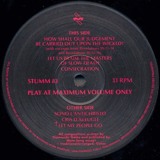 Track C1 contains excerpts from Revelations 19:11-14 and Revelations 16:12-16. Barcode: 5 016025 310838 (Text) Matrix / Runout: STUMM 83 A1 -DMM- B (Side A runout, etched) Matrix / Runout: STUMM 83 B1 -DMM- THE EXCHANGE D.M.M. D (Side B runout, etched) Matrix / Runout: STUMM 83 C1 -DMM- THE EXCHANGE D.M.M. B (Side C runout, etched) Matrix / Runout: STUMM 83 D1 -DMM- C (Side D runout, etched) Other: Variant 2 Matrix / Runout: STUMM 83 A1 - DMM - B (Side A runout, etched) Matrix / Runout: STUMM 83 B1 - DMM - THE EXCHANGE D.M.M. C (Side B runout, etched) Matrix / Runout: STUMM 83 C1 - DMM - THE EXCHANGE D.M.M. A (Side C runout, etched) Matrix / Runout: STUMM 83 A1 – DMM - A (Side D runout, etched)