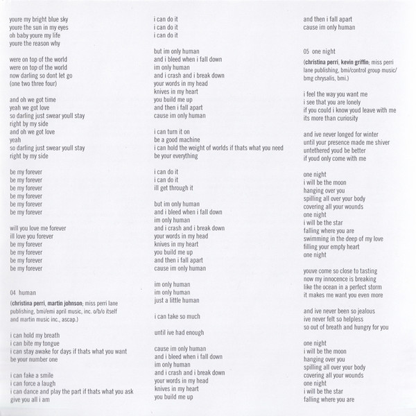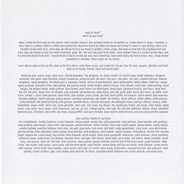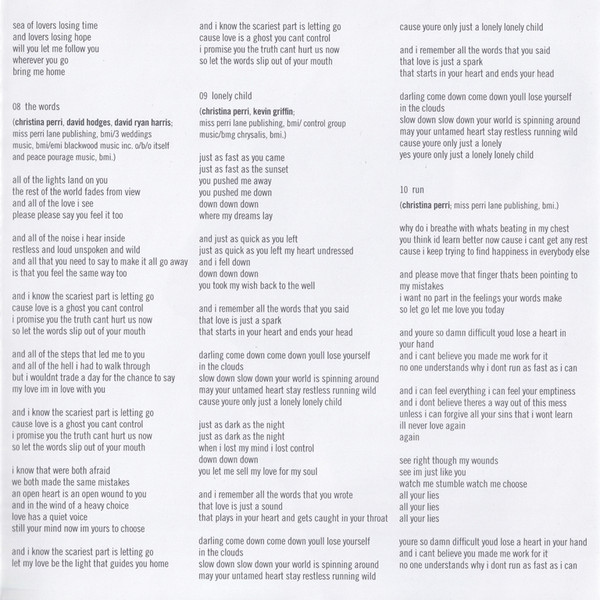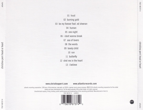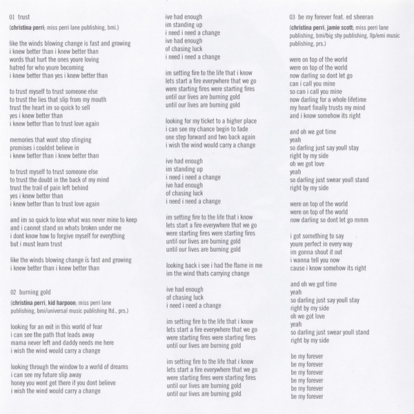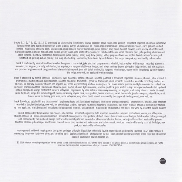 a&r Pete Ganbarg tracks 1, 3, 5, 7, 9 to 13 arranged by [strings] Ruth Barrett art direction [cover] Christina Perri tracks 1, 3, 5, 7, 9 to 13 choir [children's] Charlie Long tracks 1, 3, 5, 7, 9 to 13 choir [children's] Eli Gosling tracks 1, 3, 5, 7, 9 to 13 choir [children's] Josh Smethurt tracks 1, 3, 5, 7, 9 to 13 choir [children's] Mia Long tracks 1, 3, 5, 7, 9 to 13 choir [children's] Sophie Long tracks 1, 3, 5, 7, 9 to 13 choir [children's] Zuban Gosling tracks 1, 3, 5, 7, 9 to 13 choir [vocal] Adam Coltman tracks 1, 3, 5, 7, 9 to 13 choir [vocal] Chris Leonard tracks 1, 3, 5, 7, 9 to 13 choir [vocal] Christina Perri tracks 1, 3, 5, 7, 9 to 13 choir [vocal] Jake Gosling tracks 1, 3, 5, 7, 9 to 13 choir [vocal] Lottiey Gregson Stevenson tracks 1, 3, 5, 7, 9 to 13 choir [vocal] Lucy Gosling tracks 1, 3, 5, 7, 9 to 13 choir [vocal] Matthew Gooderham tracks 1, 3, 5, 7, 9 to 13 choir [vocal] Penny Long tracks 1, 3, 5, 7, 9 to 13 choir [vocal] Peter Gosling tracks 1, 3, 5, 7, 9 to 13 choir [vocal] Sophie Davis tracks 1, 3, 5, 7, 9 to 13 choir [vocal] Tommy Culm design Atlantic Art tracks 1, 3, 5, 7, 9 to 13 engineer Jake Gosling tracks 1, 3, 5, 7, 9 to 13 engineer Josh Mosser tracks 1, 3, 5, 7, 9 to 13 engineer Steve Rusch tracks 1, 3, 5, 7, 9 to 13 engineer [assistant] Christian Humphreys tracks 1 to 3, 5 to 13 mastered by Emily Lazar tracks 1 to 3, 5 to 13 mastered by [assistant] Rich Morales tracks 1, 3, 5, 7, 9 to 13 mixed by Manny Marroquin tracks 1, 3, 5, 7, 9 to 13 mixed by [assistant] Chris Galland tracks 1, 3, 5, 7, 9 to 13 mixed by [assistant] Delbert Bowers tracks 1, 3, 5, 7, 9 to 13 musician Alice Pratley tracks 1, 3, 5, 7, 9 to 13 musician Andy Nixon tracks 1, 3, 5, 7, 9 to 13 musician Charlotte Scott tracks 1, 3, 5, 7, 9 to 13 musician Chris Leonard tracks 1, 3, 5, 7, 9 to 13 musician Christina Perri tracks 1, 3, 5, 7, 9 to 13 musician Hannah Dawson tracks 1, 3, 5, 7, 9 to 13 musician Jake Gosling tracks 1, 3, 5, 7, 9 to 13 musician Jake Walker tracks 1, 3, 5, 7, 9 to 13 musician Jeremy Isaac tracks 1, 3, 5, 7, 9 to 13 musician John Keefe tracks 1, 3, 5, 7, 9 to 13 musician Marianne Haynes tracks 1, 3, 5, 7, 9 to 13 musician Murray Cummings tracks 1, 3, 5, 7, 9 to 13 musician Nicholas Holland tracks 1, 3, 5, 7, 9 to 13 musician Peter Gosling photography by Yu Tsai tracks 1, 3, 5, 7, 9 to 13 producer, programmed by Jake Gosling Phonographic Copyright (p) Atlantic Recording Corporation Copyright (c) Atlantic Recording Corporation Phonographic Copyright (p) WEA International Inc. Copyright (c) WEA International Inc. Recorded At Sticky Studios Recorded At Westlake Studios Mastered At The Lodge, New York Recorded At Sonora Recorders Recorded At Ruby Red Studios Recorded At Harpoon Club House Mixed At Electric Lady Studios Recorded At Conway Studios Recorded At Ocean Way Recording Mastered At Sterling Sound Recorded At Jungle City Studios Recorded At Ruby Red Productions Recorded At Abbey Road Studios