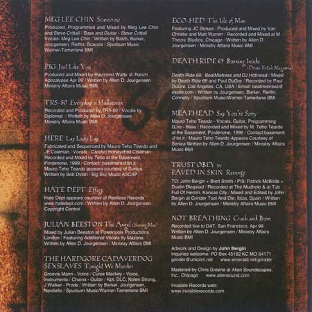 artwork, design John Bergin mastered by Chris Greene tracks 2, 3, 5, 6, 8, 10 to 12 written-by Al Jourgensen Manufactured By Caroline Records, Inc. Distributed By Caroline Records, Inc. Distributed By Caroline Distribution Mastered At Alien Soundscapes Inc. Glass Mastered At EMI MFG. Came with an insert: Special offer, part of the Cage from 1989-1990 Ministry Tour.